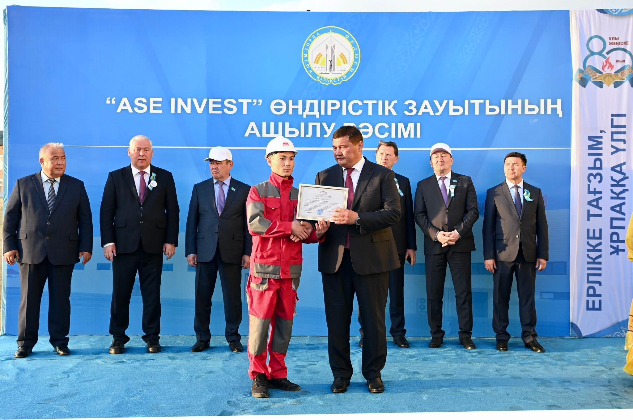 «Мемлекет басшысы Қасым-Жомарт Кемелұлы: «Мен инвестиция және бизнес саласындағы ахуалды жақсартуға, кәсіпкерлік бастамаларды қолдауға айрықша назар аударамын. Кәсіпкерлерге қолайлы жағдай жасау үшін бизнесті жүргізу мәселесіне қатысты заң қабылдадық. Қазір мемлекеттік бақылау жүйесін ретке келтіріп жатырмыз», – деген болатын. Кәсіпкерлікті қолдауға 2022-2024 жылдары әртүрлі көздерден 206 млрд. теңге тартылып, 16 мың 700 жоба қаржыландырылды. Оның 40 млрд. 931 млн теңгесі мемлекеттік бағдарлама аясында қолдау тапты. Бүгін «Ase Іnvest» серіктестігі іске қосатын зауытта шаруашылыққа қажетті ұнтақтар шығарылмақ. Жаңа зауыт құтты, жұмыстарыңыз сәтті, табысты болғай!» – деді аймақ басшысы.