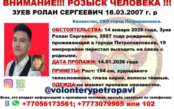 Ролан Зуевті көрген-білгендер 8 705 6173561 немесе 8 777 307965 телефон нөміріне, сондай-ақ «102» хабарласа алады.
