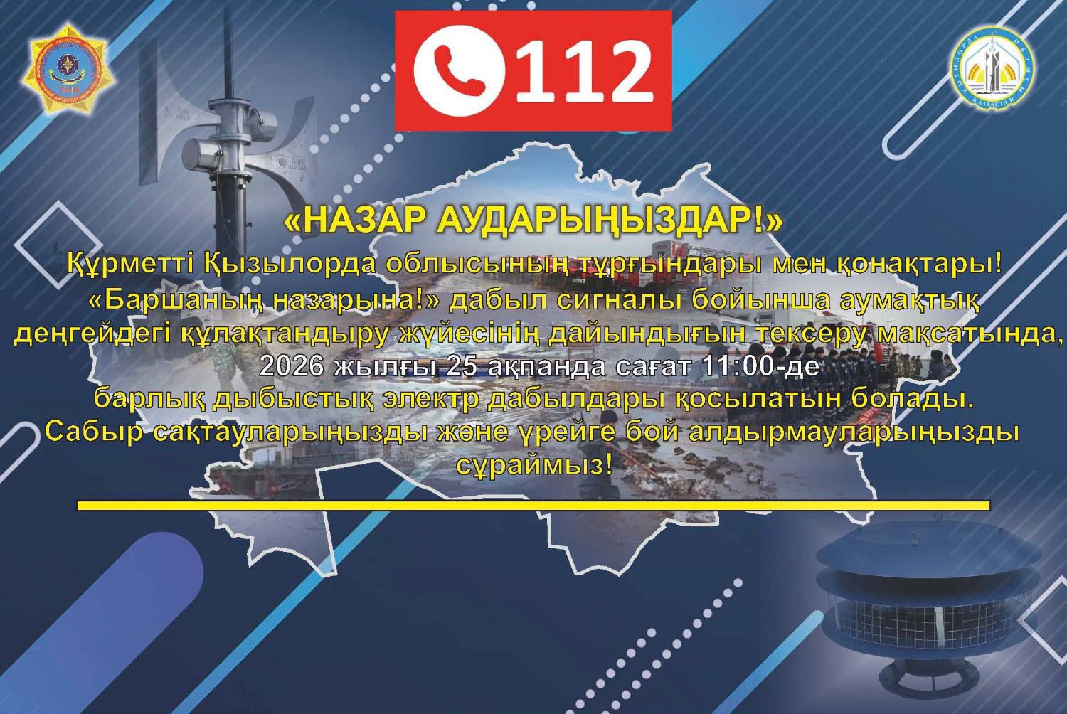 Облыс аумағында өткізілетін «Көктем-2026» республикалық командалық-штабтық оқу-жаттығуы кезінде 2026 жылғы 25 ақпанда сағат 11:00 минутта «Баршаның назарына!» сигналы бойынша облыстық азаматтық қорғаныстың құлақтандыру жүйесі тексеріледі.