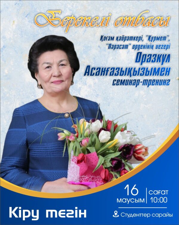 Бүгін қоғам қайраткері, “Құрмет” және “Парасат” ордендерінің иегері Оразкүл Асанғазықызы облыс жастарына арналған “Берекелі отбасы” атты семинар-тренинг өткізді.