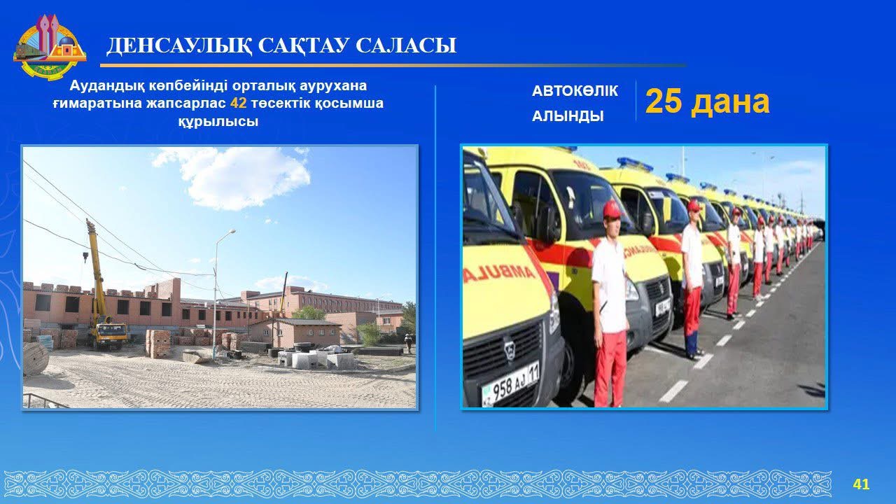 Одан бөлек, өткен жылы аймақ басшысының қолдауымен ауданның денсаулық сақтау ұйымдарының автопаркін жаңару мақсатында 25 санитарлық автокөлік алынып, бүгінде халыққа қызмет етуде.