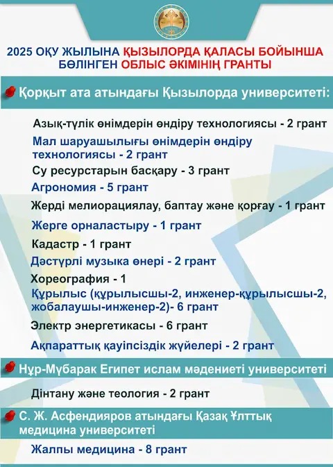 Оның ішінде, Қызылорда қаласы және қалаға қарасты кенттер мен ауылдық округтердегі орта мектеп бітірушілеріне техникалық, ауыл шаруашылығы, агрономия, қызмет көрсету, энергетика, құрылыс салалары бойынша бакалавр академиялық дәрежесінде мамандарды дайындауға 34 грант,  жалпы медицинаға 8 грант бөлінді.