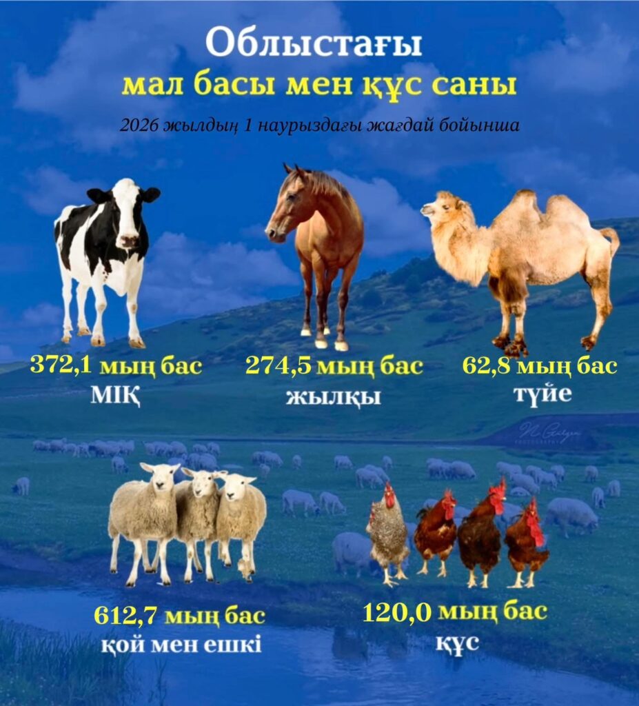 Бұдан бөлек, облыс бойынша 612,7 мың бас қой мен ешкі, 274,5 мың бас жылқы, 62,8 мың бас түйе және 120,0 мың бас құс есепке алынған.