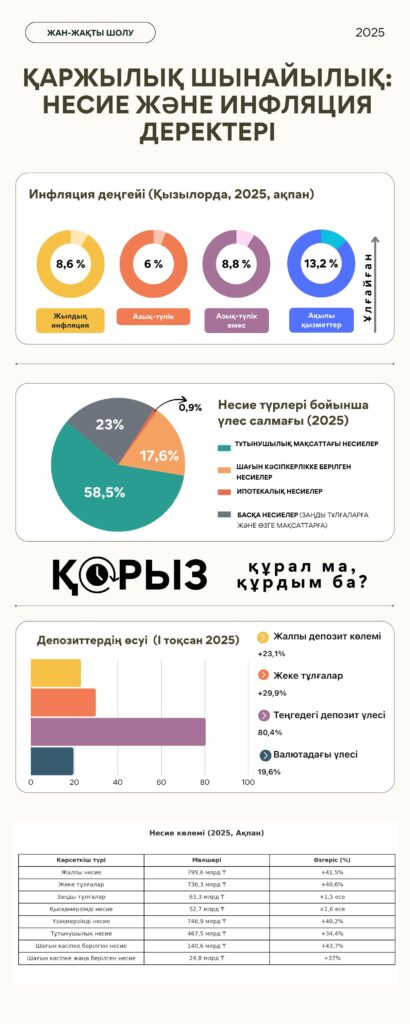 Банк секторының тұтынушылық мақсатындағы несиелері бойынша қарыз  көлемі 34,4 пайызға  өсіп, 467,5 млрд теңгенің жалпы қарыздан үлес салмағы 58,5 пайызды құрады. Жыл басындағы банк секторының берілген несиелер көлемі 111,1 млрд теңгені құраған. Шағын кәсіпкерлік субъек­тілерінің несиелендіру бойынша қары­зы 43,7 пайызға өсіп, 140,6 млрд теңгеге жетті. Жалпы қарыздан үлес салмағы – 17,6 пайыз. 2025 жылдың қаңтар-ақпан айында шағын кәсіпкерлік субъектілеріне берілген несие­лер көлемі 24,8 млрд теңгені құрады. 2024 жылдың сәйкес кезеңімен салыс­тырғанда бұл көрсеткіш 37 па­йызға  өскен.