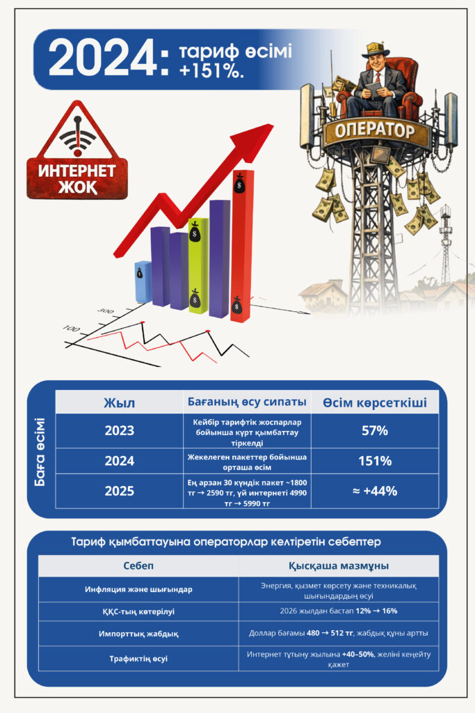 Мәселе мұнымен біткен жоқ, өткен 2025 жылы ұялы байланыс тағы қымбаттады. Үкімет өкілдері 2024 жылдың соңында операторлармен жүздесіп, жаңа жылдан бұрын тарифті өсірмеу туралы «мораторий» жасағандай болған еді, бірақ мереке өткесін-ақ бағалар қайта көтеріле бастады. Tele2/Altel сәуір айында өзінің топтамаларының ақысын орта есеппен 20-35%-ға өсірді. Beeline ақпанда үйдегі интернет тарифін 4990 теңгеден 5990 теңгеге дейін көтерді. Жыл соңына қарай да елеулі ақпар айтылды. Желтоқсанның 25-інен Tele2 және Altel көпшілік тарифтерін қосымша 15-33% мөлшерінде қымбаттатады екен, ал Beeline 2026 жылдың 1 қаңтарынан бастап бағаларын шамамен 15-20%-ға өсірмек. Мысалы, Tele2-нің ең арзан 30 күндік пакетінің бағасы бұрынғы 1800 теңгеден 2590 теңгеге шығады. Жалпы алғанда, 2023-2025 жылдары ұялы байланыс үшін абоненттік төлемдер жыл сайын екі таңбалы пайыздарға өсіп отыр, бұл – жалпы тұтынушылық инфляция деңгейінен әлдеқайда жоғары көрсеткіш.