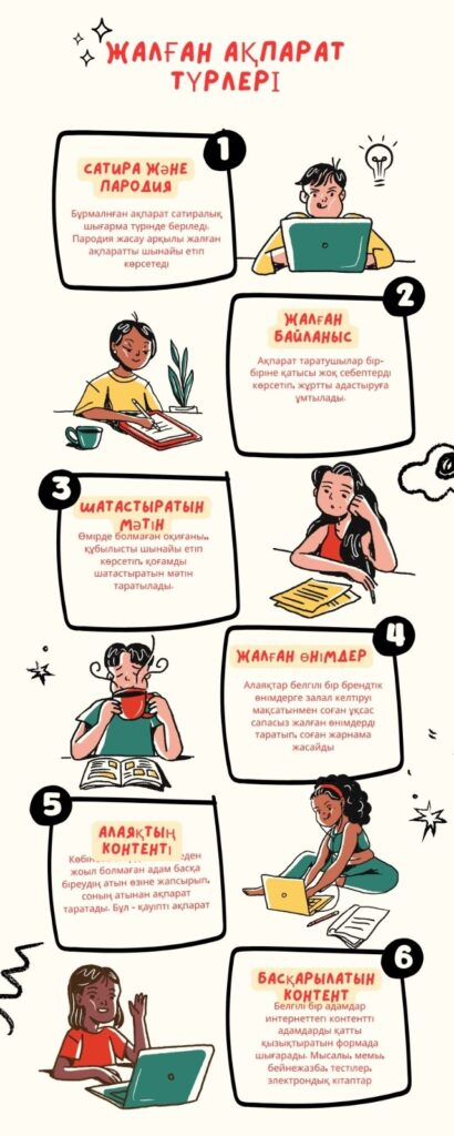 Жеке зерттеу еңбегімде жазылғандай, жалған ақпараттың негізгі 6 түрі бар. 1. Сатира және пародия. Бұл жерде бұрмаланған ақпарат сатира, соның ішінде пародия түрінде беріледі. Яғни, пародия жасау арқылы жалған ақпаратты шынайы ақпарат ретінде көрсетеді. 2. Жалған байланыс. Бұл тәсіл қазір жиі қолданылады. Ақпарат таратушылар бір-біріне қатысы жоқ себептерді көрсетіп, жұртты адастыруға ұмтылады. 3. Шатастыратын мәтін. Бұл жерде өмірде болмаған оқиғаны, құбылысты шынайы етіп көрсетіп, қоғамды шатастыратын мәтінді жаппай таратады. 4. Жалған өнімдер. Алаяқтар белгілі бір танымал брендтік өнімдерге залал келтіру мақсатымен соған ұқсас сапасыз жалған өнімдерді таратып, соған керемет жарнама жасайды. 5. Алаяқтың контенті. Көбіне өмірде жолы болмаған адам басқа біреудің атын өзіне жапсырып, соның атынан ақпарат таратады. Бұл – зиянды әрі қауіпті ақпарат. 6. Басқарылатын контент. Белгілі бір адамдар интернеттегі контентті адамдарды қызықтыратын формада шығарады. Мысалы, мемдер, бейнежазбалар, тестілер, электрондық кітаптар.