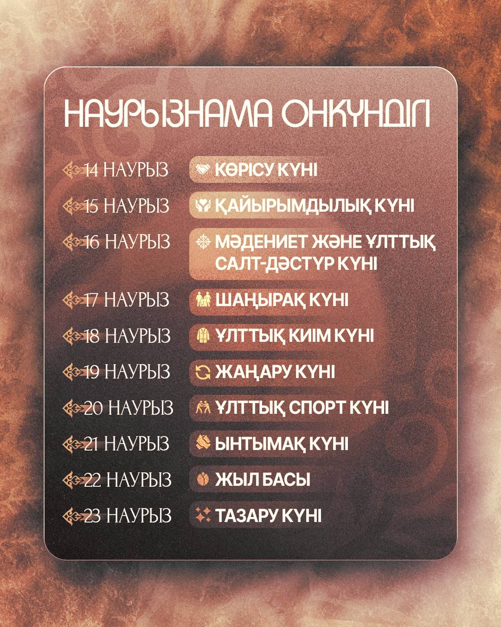 Наурызнама онкүндігі қазақ халқының мәдениеті мен салт-дәстүрін жаңғыртып қана қоймай, қоғамдағы өзара сыйластық, мейірім, ынтымақ, тазалық, отбасы құндылығы секілді маңызды ұғымдарды кеңінен насихаттауға бағытталған. Онкүндік аясында еліміздің барлық өңірінде мәдени-көпшілік іс-шаралар, қайырымдылық акциялары, спорттық жарыстар, ұлттық киім мен ұлттық өнерді ұлықтайтын бастамалар ұйымдастырылады. Мерекелік күндер тізбегі 14 наурыздағы Көрісу күнінен бастау алады. Одан кейін 15 наурыз – Қайырымдылық күні, 16 наурыз – Мәдениет және ұлттық салт-дәстүр күні, 17 наурыз – Шаңырақ күні, 18 наурыз – Ұлттық киім күні, 19 наурыз – Жаңару күні, 20 наурыз – Ұлттық спорт күні, 21 наурыз – Ынтымақ күні, 22 наурыз – Жыл басы, ал 23 наурыз – Тазару күні ретінде аталып өтеді. Наурызнама онкүндігі мерекені тек думанды шара деңгейінде емес, мазмұны терең, тәрбиелік әрі қоғамдық маңызы зор кезең ретінде қабылдауға мүмкіндік береді. Бұл бастама арқылы ұлттық болмыс, тарихи жады және заманауи қоғамның ортақ құндылықтары өзара сабақтасып, Наурыздың мәні бұрынғыдан да кеңейе түседі.