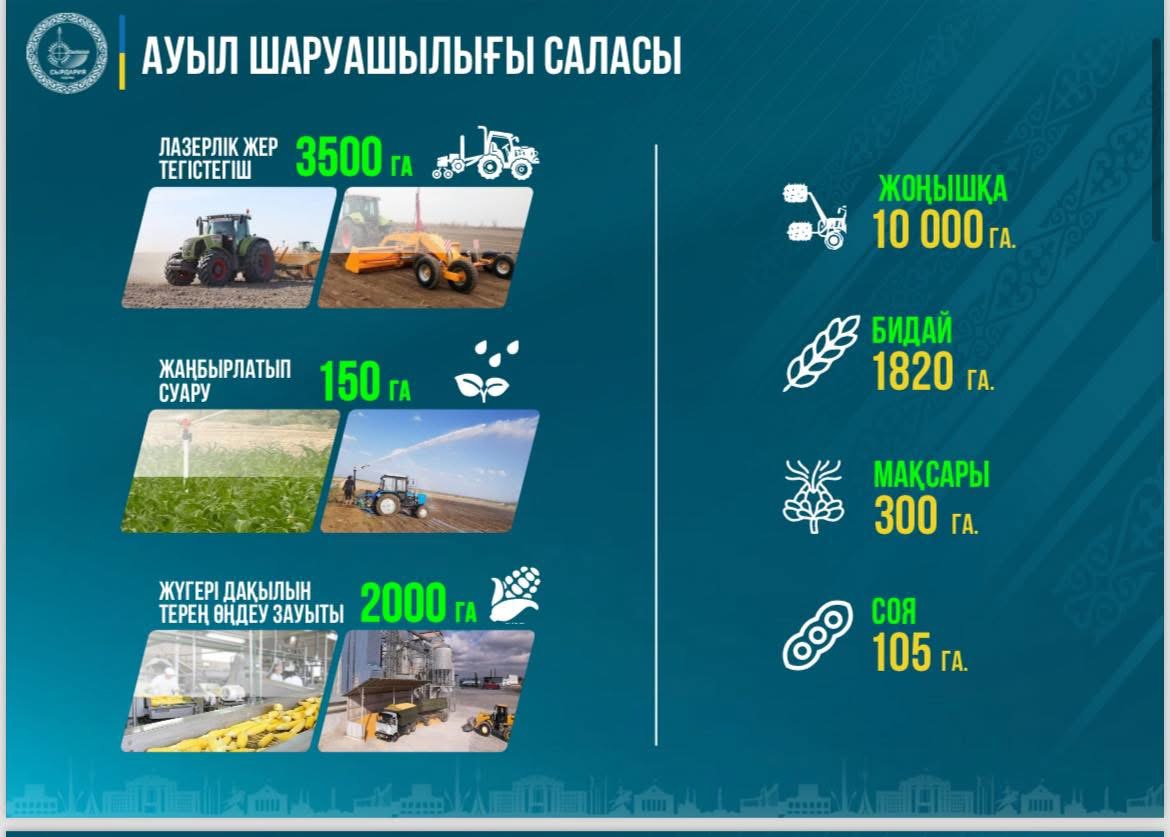 – Аудан шаруашылықтарындағы еңбеккерлердің еселі жұмыстарының нәтижесінде облыс көлемінде Сырдария ауданы «Егін шаруашылығы бойынша озат аудан» атанды. Мемлекет басшысының Сыр еліне жасаған жұмыс сапары барысында берген тапсырмасына сәйкес, ауданда суды көп қажет ететін дақылдар көлемін оңтайландыру және су үнемдеу технологияларын енгізу бағытында жүйелі жұмыстар жүргізілуде. Осы мақсатта егістік алқаптарда лазерлік жер тегістеу әдісі қолданылып, нәтижесінде 30 пайызға дейін су үнемделіп, егін шығымы артты. Өткен жылы шаруашылық құрылымдары заманауи лазерлік жер тегістегіш техниканың көмегімен 3 500 гектар жерге тегістеу жұмыстарын жүргізді. Қазіргі таңда ауданда бұл бағыттағы жұмыстар 70 пайызға жетті. Сонымен қатар, шаруашылықтар 150 гектар алқапқа жаңбырлатып суару әдісімен әртүрлі дақылдар егіп, жақсы нәтиже көрсетті. Мемлекет басшысының тапсырмасына сәйкес әлеуметтік маңызы бар азық-түлік қауіпсіздігін қамтамасыз ету және баға тұрақтылығын сақтау мақсатында ауданда 805 гектар жерге бақша және көкөніс дақылдары егілді. Оның ішінде Айдарлы, Жетікөл, Аманкелді, Шіркейлі, Бесарық, Асқар Тоқмағамбетов ауылдарында жастар бригадалары 100 гектарға жуық алқапқа бақша дақылдарын орналастырып, мол өнім алды. Мал шаруашылығын дамыту жұмыстары да аудан бойынша жүйелі түрде жүргізілуде. Өткен жылы мүйізді ірі қара басының саны 4,1 пайызға, жылқы 9,4 пайызға, құс 16,5 пайызға артты. Сонымен қатар, ет өндірісі 1,1 пайызға, ал сүт өндірісі 4,1 пайызға өсті, – деді Берік Әбдіғаппарұлы.