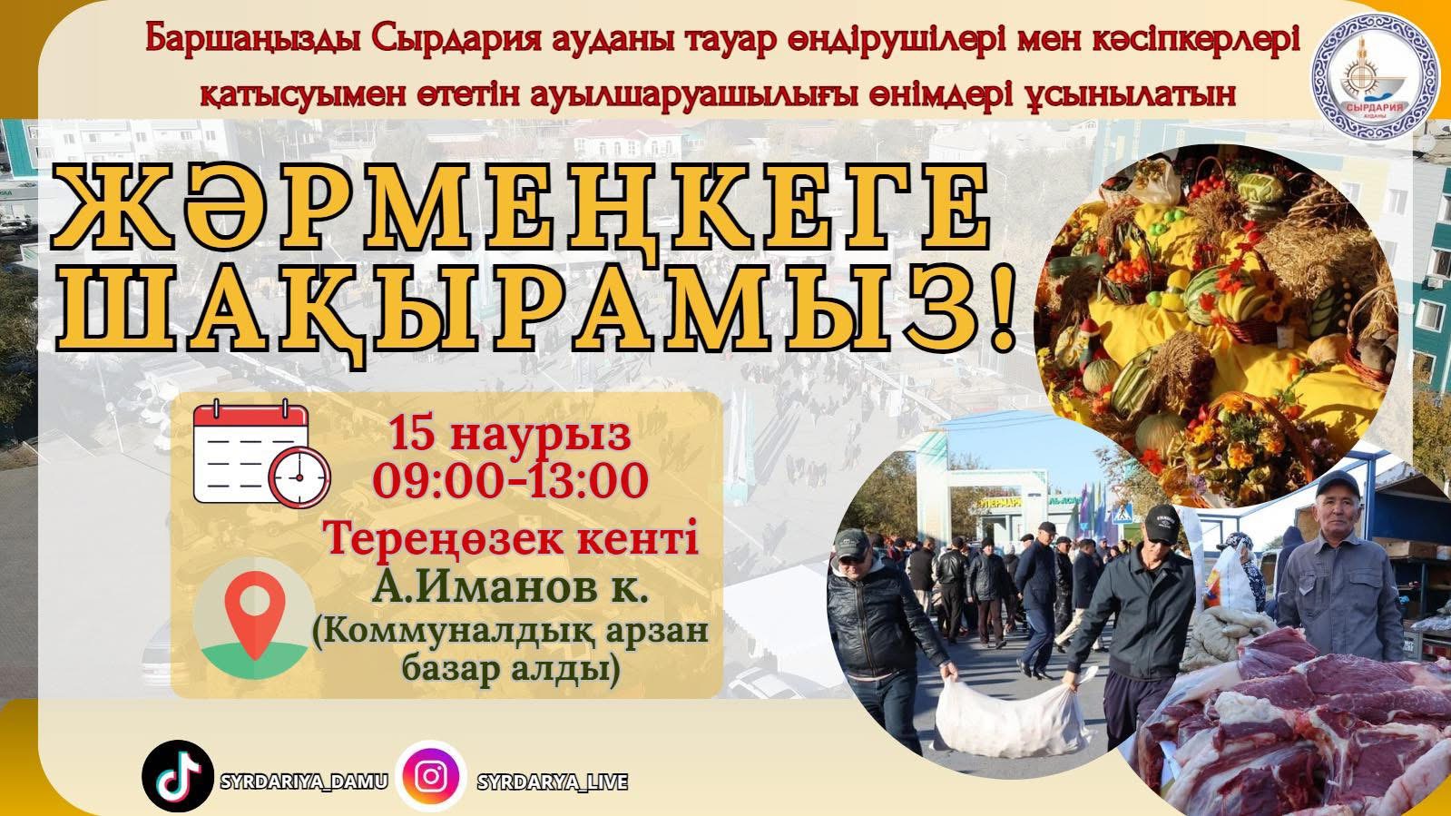 Сырдария ауданы әкімдігінің ұйымдастыруымен 2026 жылдың 15 наурыз күні сағ 9:00-де Тереңөзек кенті, А.Иманов көшесі (Коммуналдық арзан базар алды) бойында әлеуметтік маңызы бар азық-түлік өнімдерінің жәрмеңкесі өткізіледі.