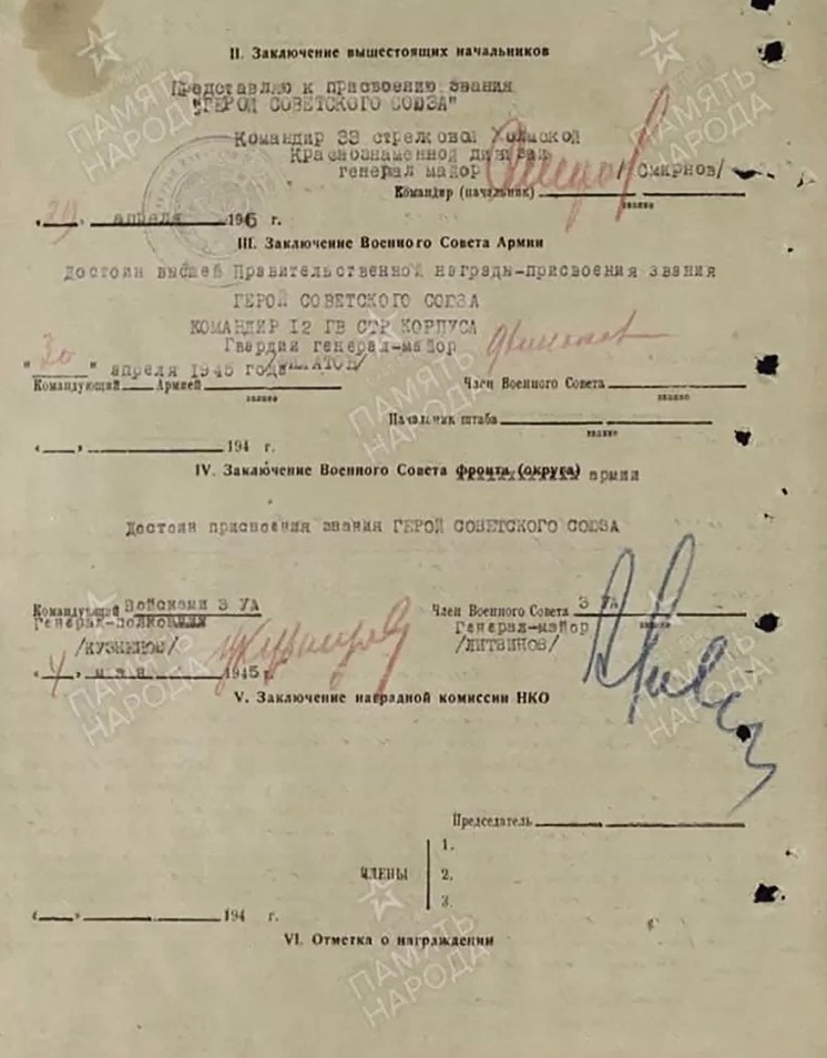 Бұл ұсынысқа 33-ші Қызылтулы дивизия командирі, генерал-майор Смирнов лейтенант П.Наурызбаевты Кеңес Одағының батыры атағына ұсынғанда, оны Армияның Әскери Кеңесі де келісім берген. «Кеңес Одағының Батыры атағына лайық» деп 12-ші гвардиялық атқыштар корпусының командир,і гвардия генерал-лейтенанты Филатов, үшінші Екпінді Украина Армиясының қолбасшысы генерал-полковник Кузнецов, Әскери-Кеңес мүшесі, генерал-майор Литвинов (6-сурет) қол қойған.