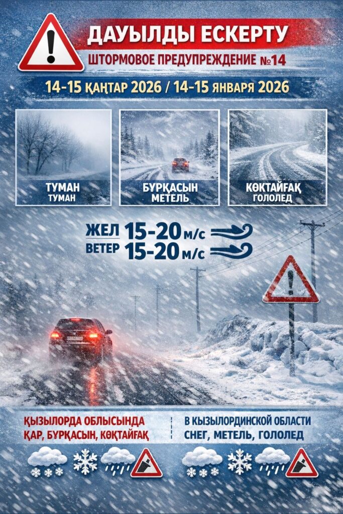 Қызылорда облысында 14 қаңтар сағат 20:00-ден 15 қаңтар сағат 20:00 аралығында дауылды ескерту жарияланды, деп жазады өңірлік коммуникациялар қызметі.