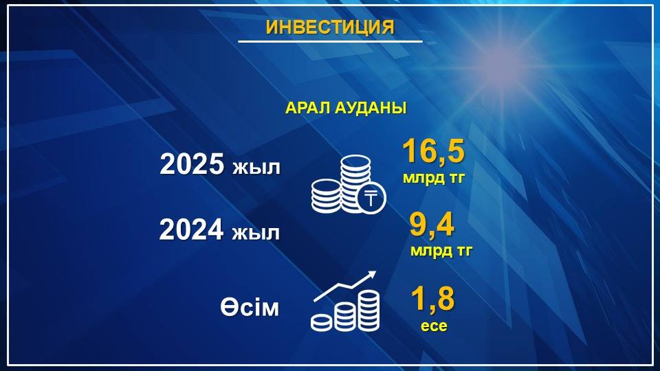 Арал ауданында ағымдағы жылдың алғашқы жартыжылдығында айтарлықтай әлеуметтік-экономикалық өсім тіркелді. Спикердің сөзінше, жыл басынан бері Арал ауданына тартылған инвестиция көлемі 16,5 миллиард теңгеден асып, өткен жылдың осы кезеңімен салыстырғанда 1,8 есеге көбейген (2024 жылы – 9,4 млрд теңге).