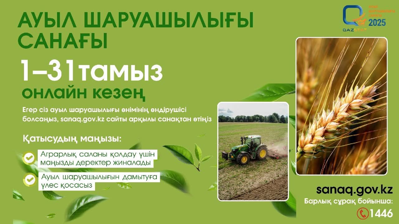 1-31 тамыз аралығында Қазақстанда Ұлттық ауыл шаруашылығы санағының бірінші кезеңі өтеді. Осы уақыт аралығында барлық қатысушы sanaq.gov.kz сайтында онлайн форматта санақтан өте алады. Сайтта ауыл шаруашылығы өндірушілері мен үй шаруашылықтарына арналған екі түрлі сауалнама парағы болады.