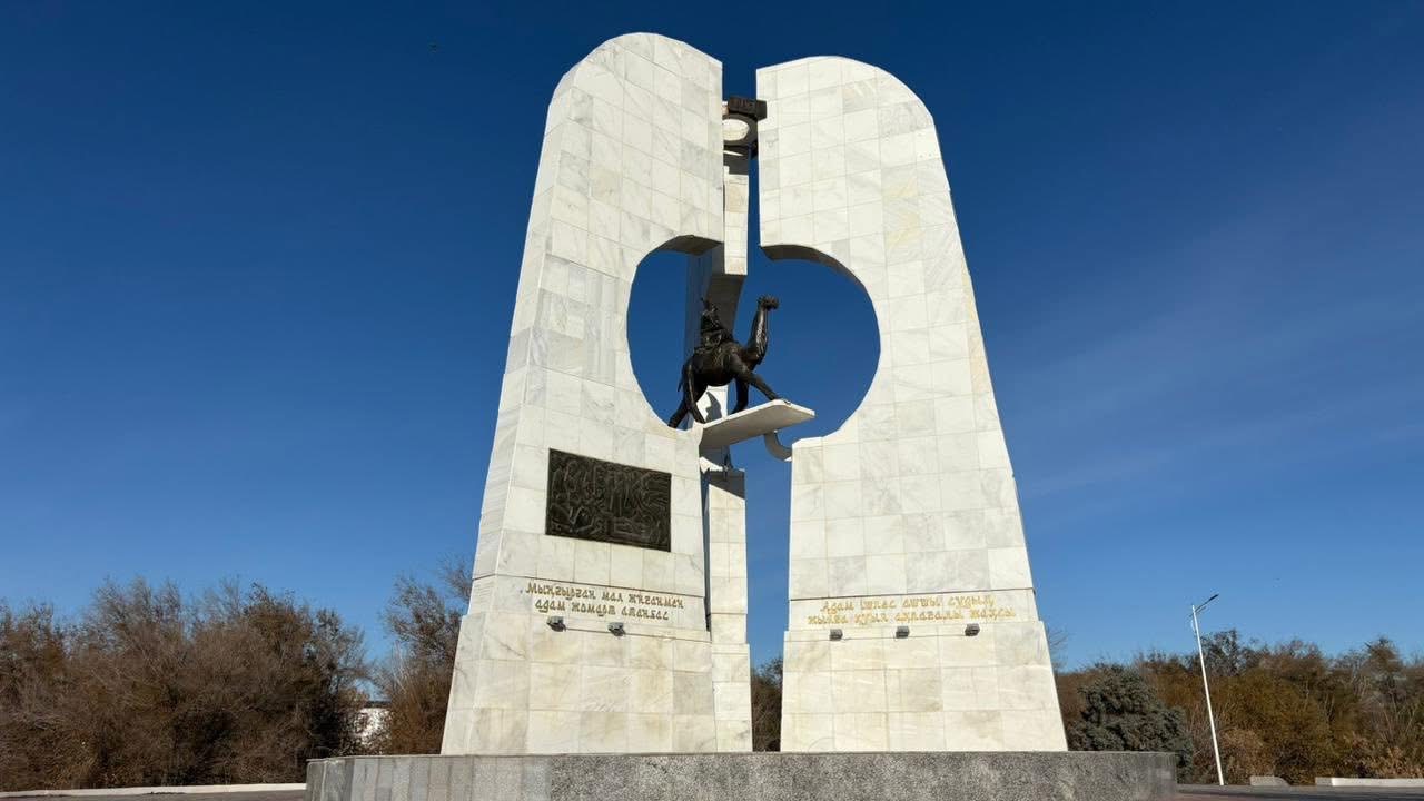 Оның биіктігі 12 метрды құрайды. Бұл көркем туынды қасиетті Сыр өңірінің символы ретінде бағалы. Ортасында желмаяға мінген Қорқыт Ата қобызымен бейнеленген.