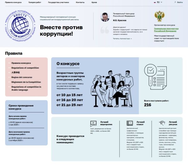 Ресей Федерациясының Бас прокуратурасы тарапынан Халықаралық сыбайлас жемқорлыққа қарсы кеңестің қамқорлығымен жастар үшін ұйымдастырылған «Сыбайлас жемқорлыққа бірге қарсымыз!» атты сыбайлас жемқорлыққа қарсы әлеуметтік жарнаманың кезекті жыл сайынғы халықаралық жастар байқауы басталды. Байқауға қатысуға 10-25 жас аралығындағы жастар қатысады. Олар сыбайлас жемқорлықпен күрес туралы өз идеялары мен көзқарастарын, сондай-ақ оның рөлі мен осы бағыттағы халықаралық ынтымақтастықтың маңыздылығын көрсете отыра, «Сыбайлас жемқорлыққа бірге қарсымыз!» тақырыбында конкурстық жұмыстар дайындауға шақырылады.