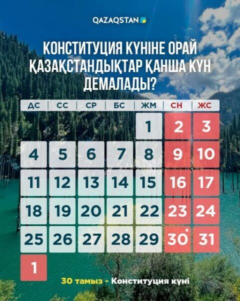 30 тамызда қазақстандықтар Конституция күнін атап өтеді. Мереке сенбі күнге сәйкес келіп тұрғандықтан, демалыс 1 қыркүйек – дүйсенбі күнге ауыстырылады.