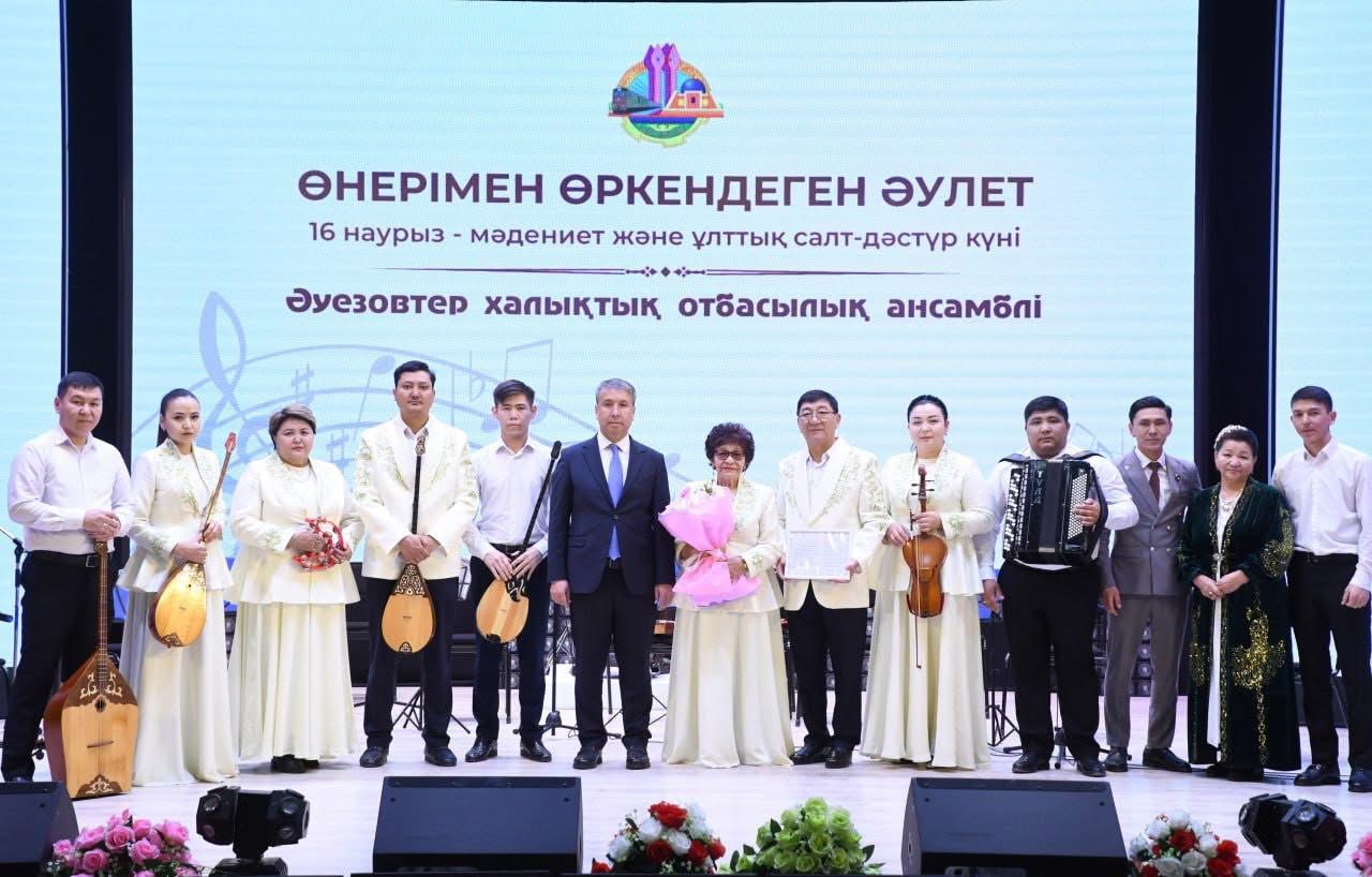 -Өнер – ұлттың рухани байлығы. Ал сол өнерді бір отбасының бірнеше буыны жалғастырып, халыққа қызмет етсе – бұл үлкен мақтаныш. Әуезовтер отбасылық ансамблі – дәл осындай өнегелі әулеттердің бірі. Ансамбльдің негізі 1977 жылы қаланып, содан бері ұлттық өнерімізді дәріптеп келе жатқан бірегей шығармашылық ұжымға айналды. Ансамбльдің қалыптасуы мен дамуына үлкен еңбек сіңірген өнер иелері – Махамбет Әуезов пен Раманқұл Әуезов. Олар тек орындаушы ғана емес, қазақтың күйі мен әнін, қобыз бен домбыра өнерін насихаттап, шәкірт тәрбиелеген ұстаздар. Осы бір айтулы күні өңіріміздің мәдениеті мен өнерін өркендетудегі қызметтеріңіз үшін шығармашылық ұжымға шынайы алғысымды білдіремін. Ел мәдениетінің одан әрі гүлденуіне, өнеріміздің асқақтауына қызмет етіп, халқымызды шығармашылық табыстарыңызбен қуанта берулеріңізге тілектеспін, — деді аудан әкімі Алмасбек Әбілқасымұлы.