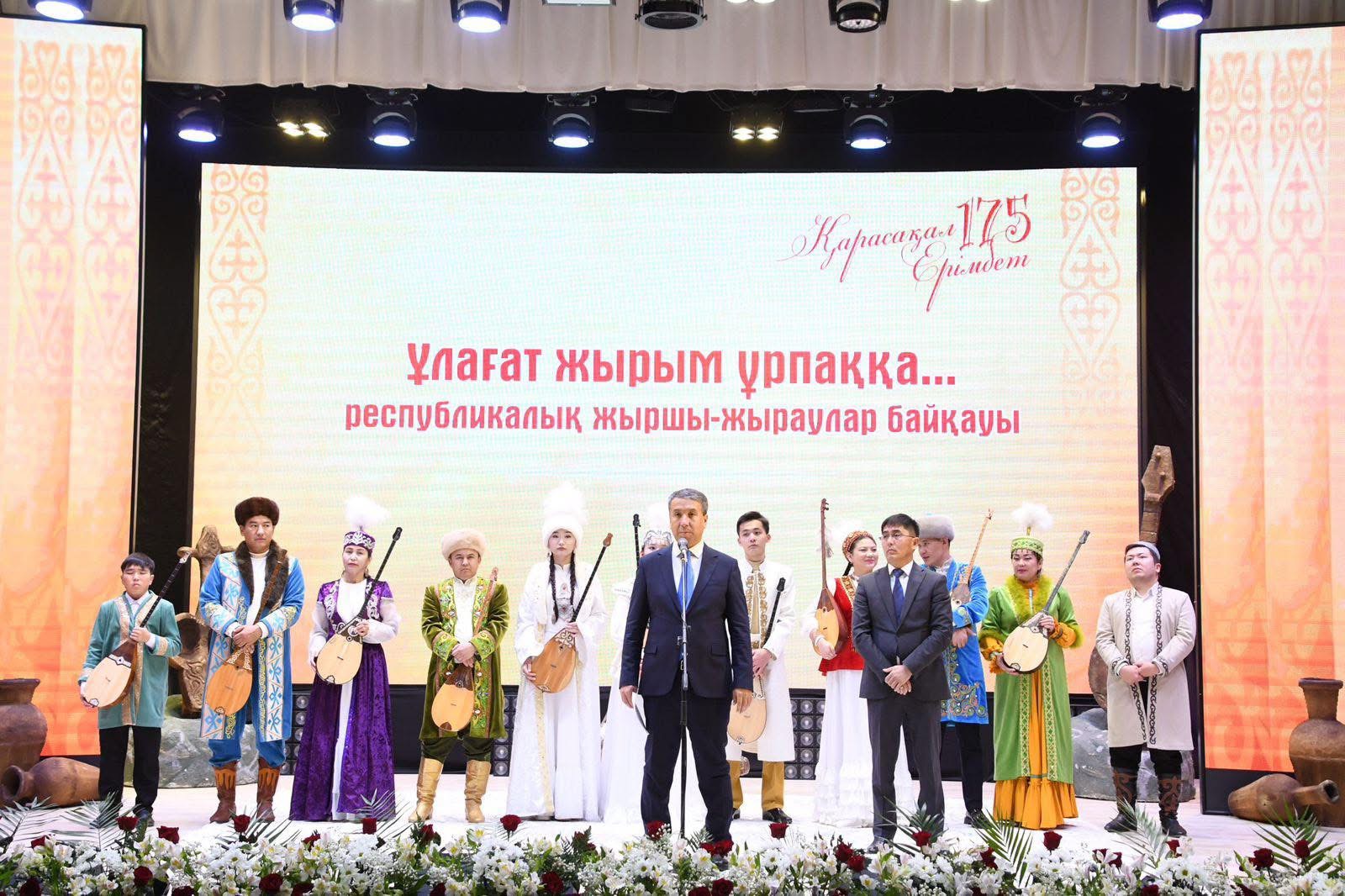 Мұнан кейін жыршы-жыраулар шайыр Қарасақал Ерімбеттің терме-толғау, айтыстарынан бір шығарма және еркін тақырыпта бір шағармадан үзінділер орындады.
