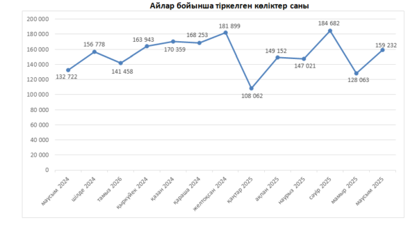 2025 жылғы маусым айында Қазақстанда 159,2 мың көлік алғаш рет тіркелді. Оның ішінде 143 мың жеңіл автомобиль, 9,8 мың жүк көлігі, 1,3 мың автобус, 5,1 мың мотоцикл және мототехника.