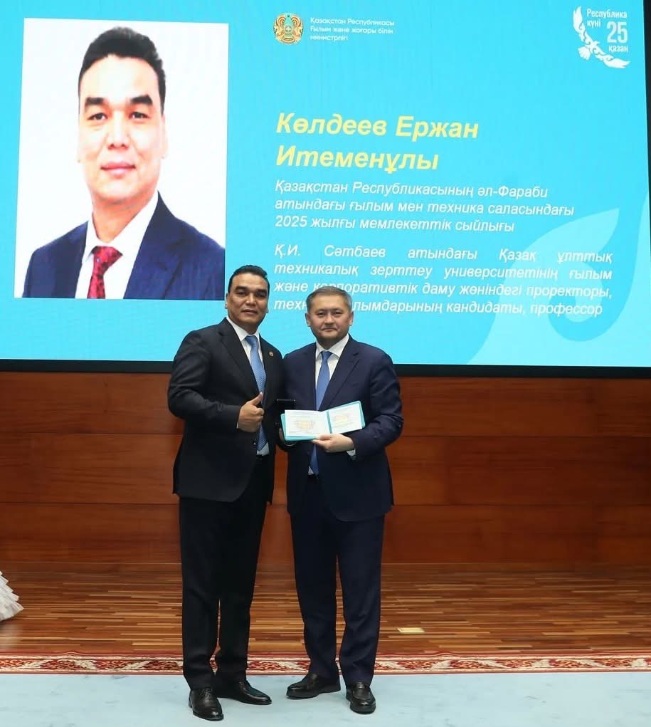 Қ.И. Сәтбаев атындағы Қазақ ұлттық техникалық зерттеу университеті» коммерциялық емес акционерлік қоғамының ғылым және корпоративтік даму жөніндегі проректоры, техника ғылымдарының кандидаты, профессор Ержан Итеменұлы Көлдеевке Қазақстан Республикасының әл-Фараби атындағы ғылым мен техника саласындағы Мемлекеттік сыйлығы берілді.