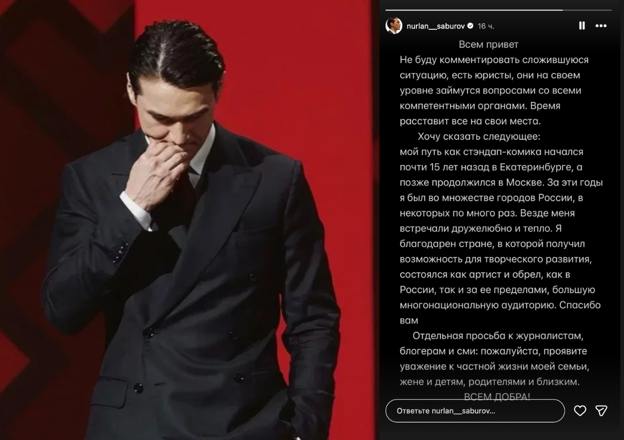 Танымал стендап-комик Нұрлан Сабуров соңғы күндері өзіне қатысты тараған ақпараттардан кейін әлеуметтік желіде мәлімдеме жариялады. Бұған дейін бірқатар ақпарат құралдарында оның Ресейге 50 жылға кіруіне тыйым салынғаны туралы хабар тараған болатын. Өнер иесі жазбасында қалыптасқан жағдайға қатысты пікір білдіруден бас тартатынын айтты.