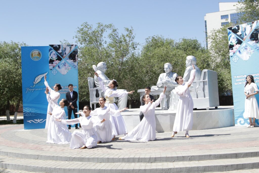 HALYQLINE.KZ Бүгін шаһар төріндегі қайта жаңарып, ажары айшықталған «Қаламгерлер» аллеясында БАҚ өкілдерінің мерейлі мерекесіне арналған салтанатты іс-шара өтті. Сыр бойы әдебиетінің үш алыбы ескерткішінің жанына жиылған қаламгерлер ең әуелі қалам құдіреті мен қасиетін бейнелейтін қалалық Жастар театры әртістерінің тақырыптық қойылымын тамашалады.