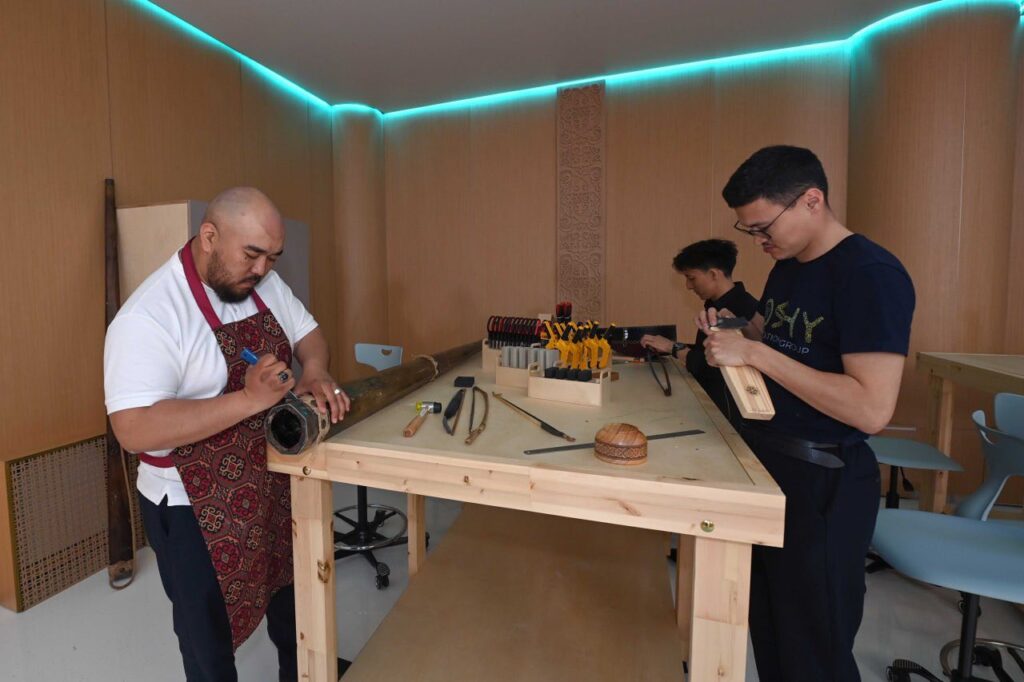 Мемлекет басшысы зергерлік және ағаш шеберханаларын, музыка, кілем тоқу, бейнелеу өнері залдарын, fashion-аймақты аралады.