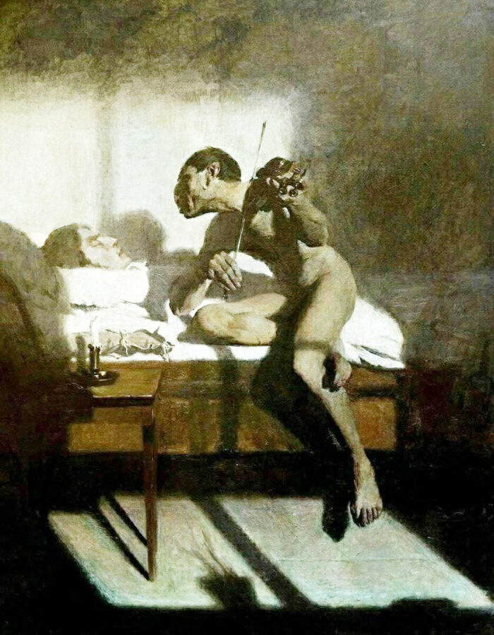 Паганинидің шайтанмен келісімі туралы бұл хикая суретші Эдвард Окуньге ерекше әсер етіп, ол осы оқиғаға негізделген картина салуға бел буады. Суретші кенеп бетінде тылсым күштің музыканттың алдына келіп, өз үлесін талап ететін сәтін бейнелеген.