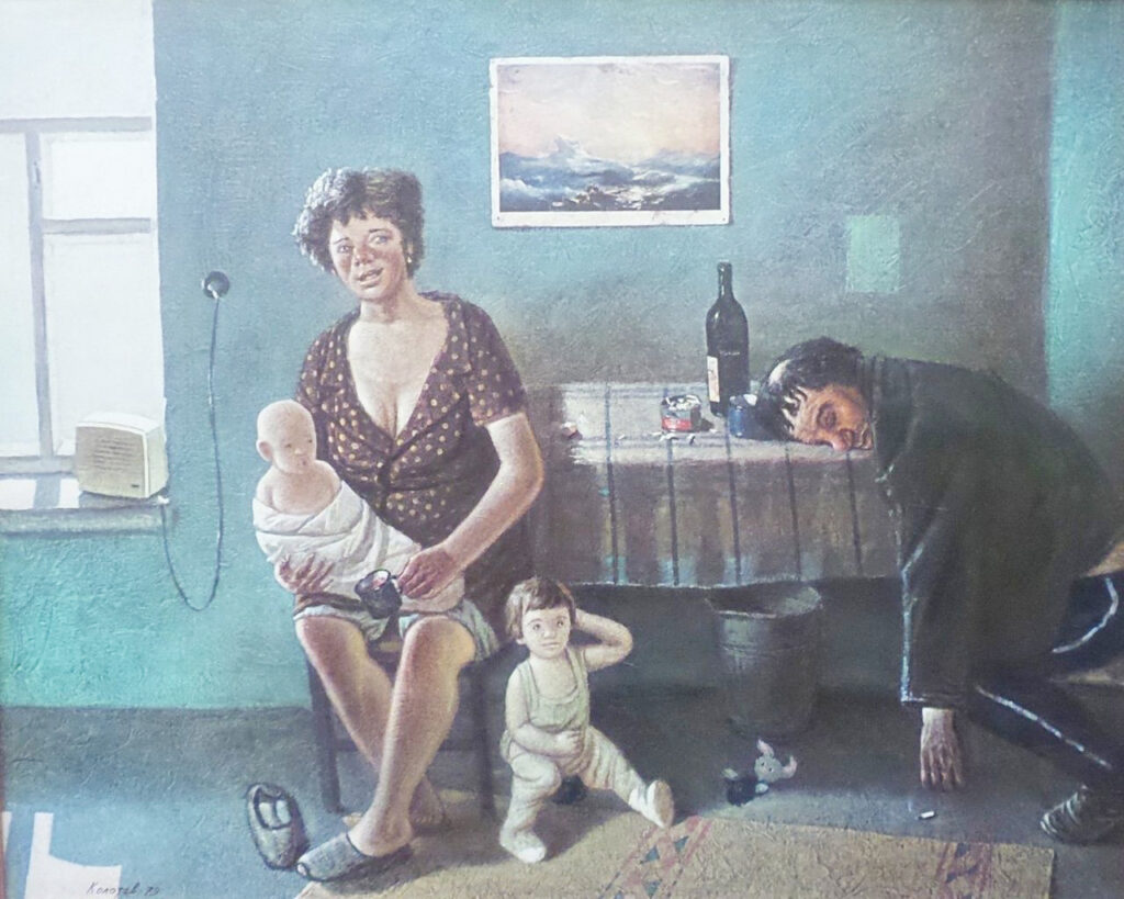 Алайда отбасында маскүнемдер үй ішіне ауыртпалық әкелетін. Колотев картинасында әйелдің шыдамы таусылуға жақын қалғаны айқын көрінеді. Суретшінің бұл туындыны «Тоғызыншы толқын» деп атауы да бекер емес – күйеуінің кезекті ішімдікке салынуы бейшара әйелді ажал толқынындай басып қалғандай әсер береді. Асүй қабырғасында Айвазовскийдің дәл осылай аталатын картинасының ілініп тұруы да терең символдық мәнге ие.