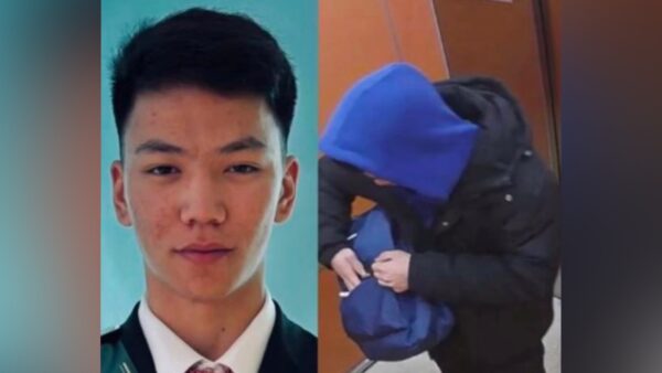 Үстіндегі киімі: қара куртка, көк толстовка, қара бас киім, қара шалбар, қара кроссовка, көк рюкзак. (Киімі – оң жақтағы фотодағымен сәйкес.)