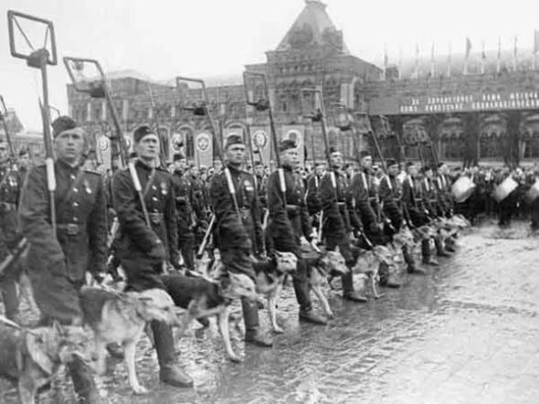 Кеңес-Герман соғысының аяқталу құрметіне 1945 жылдың 24 маусымында Қызыл алаңда атақты Жеңіс парады болғанын білесіздер. Осы парадта жеңіске өз үлесін қосқан қызметтік иттер өзінің нұсқаушыларымен жүріп өтті (фото).