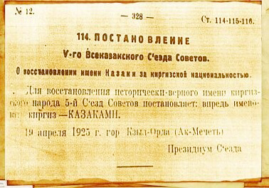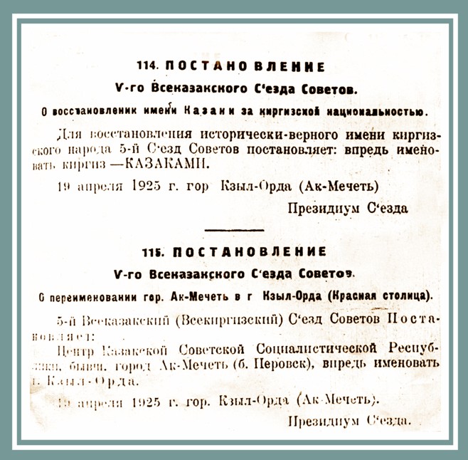 Бұдан 100 жыл бұрын – 1925 жылғы 15-19 сәуірде Ақмешітте болған Қазақстан Кеңестерінің 5-ші съезі Түркістан Республикасындағы Сырдария және Жетісу облыстарының, Бұхара, Хорезм халық республикаларындағы қазақтар да кіретін аумақтардан ұйысқан Қарақалпақ облысының Қазақ Республикасына біріктірілгенін жария етті. Бір шаңырақ астына жиналған біртұтас қазақ елі құрылды, оның мұқтаждықтары қарастырылып, кең көлемді қарарлар қабылданды. Халықтың этникалық аталымы ресми түрде өзіне қайтарылды. Бұрмаланған атаумен ту тіккен қазақтың кеңестік республикасы өз тарихи атымен аталды. Жаңа астанасына заманның және жаңғырып жатқан ұлттың рухына сай келетін айбынды ат берілді.