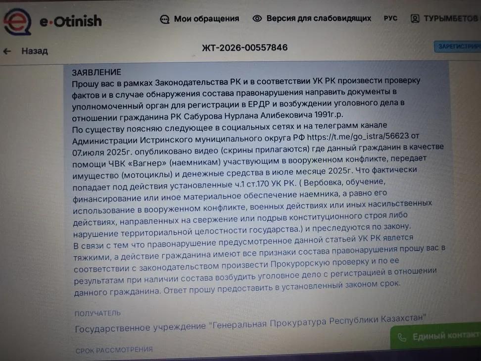 Ақпаратта айтылғандай, өтінішке интернетте бұрын жарияланған бейнежазба себеп болған. Белсендінің мәлімдеуінше, видеода көрсетілген жайттар мүлік немесе қаржылай көмектің қарулы қақтығысқа қатысы бар тұлғаларға берілуі мүмкін деген күдік тудырады. Осыған байланысты ол жарияланған материалдарға құқықтық баға беруді және заң бұзушылық анықталған жағдайда тиісті процессуалдық шаралар қабылдауды сұрап отыр.