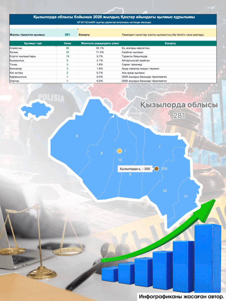 Ал Қызылорда облысында осы кезеңде 281 қылмыстық құқықбұзушылық әрекеті жасалғаны көрсетілген. Бұл – республикадағы көптеген өңірмен салыстырғанда төмен көрсеткіштің бірі. Алайда қылмыс статистикасын тек жалпы сан арқылы бағалау жеткіліксіз. Қылмыстың нақты түрлерін және оның жыл сайын қалай өзгеріп отырғанын қарау арқылы ғана өңірдегі қауіпсіздік жағдайын дұрыс бағалауға болады.