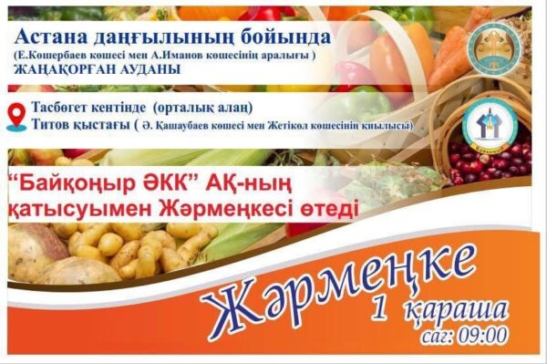 Титов қыстағында (Ә.Қашаубаев пен Жетікөл көшелерінің қиылысы) «Байқоңыр ӘКК» АҚ-ның қатысуымен өтетін жәрмеңкеге шақырамыз!