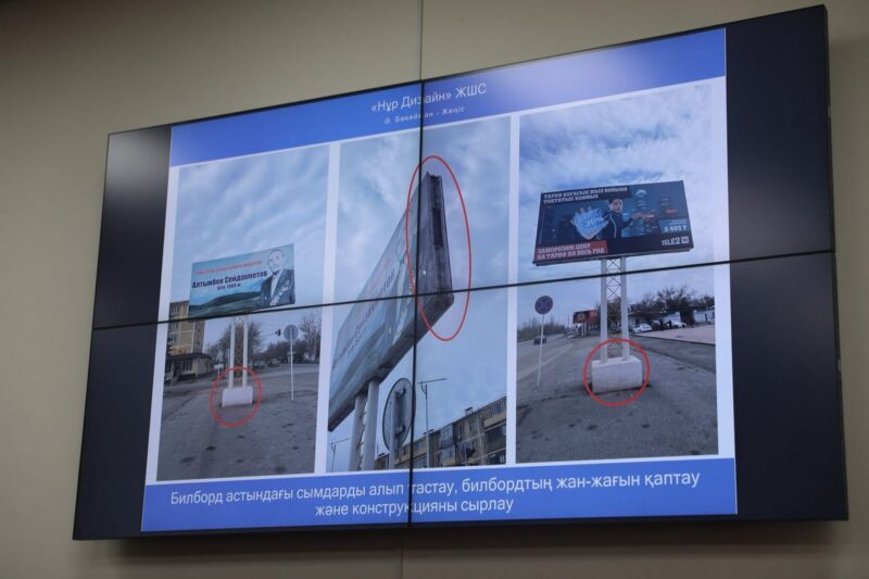 Қазіргі таңда, шаһарда жеке кәсіпкерлерге тиесілі 145 жарнама тұғыры орналасқан. Одан бөлек, 12 ЛЭД экран бар. Жиында аталған тұғырлардың үйлесімсіз орналасуы, бұрын пайдаланылған сымдарының алынбауы, конструкциялардың қисайып тұруы және ЛЭД экрандардың көлік жүргізушілеріне жарығымен кедергі келтірмеуі айтылып, анықталған кемшіліктер бойынша кәсіпкерлерге ескертулер жасалды.