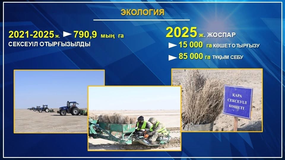 Қазақстан Республикасы Президенті Қасым-Жомарт Тоқаев өз Жолдауында экологиялық жағдайды жақсартуға ерекше көңіл бөліп, нақты тапсырмалар берген болатын. Осы тапсырмалар аясында Арал теңізінің құрғаған ұлтанына алдағы бес жыл ішінде жалпы аумағы 1,1 миллион гектар жерге сексеуіл егу жұмыстары жоспарланған. Бұл туралы бүгін Өңірлік коммуникациялар қызметінің ақпарат алаңында Арал ауданының әкімі Аманжол Оңғарбаев мәлімдеді.