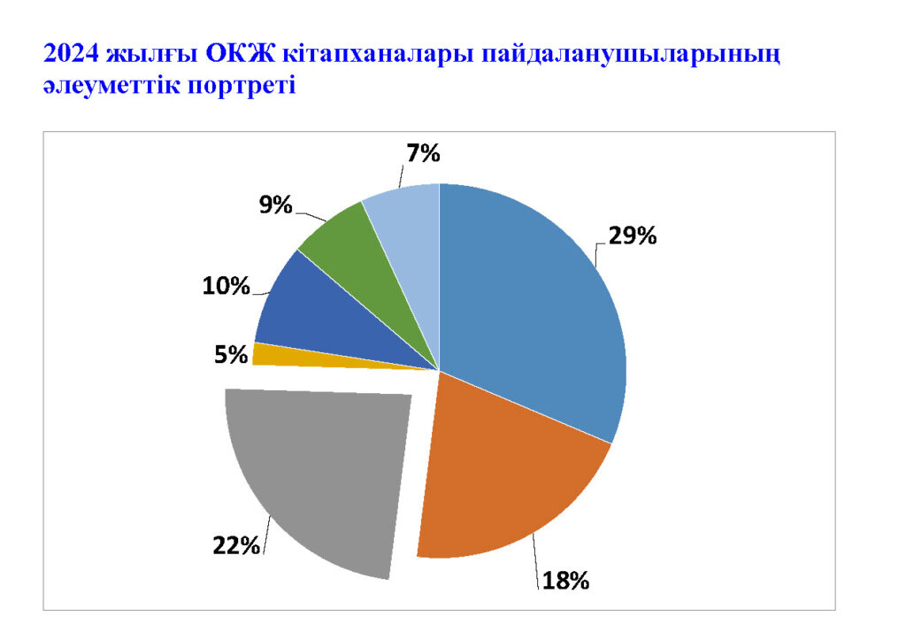 Осы жерде қаладағы  кітапханалар қызметін пайдаланушылардың әлеуметтік портретіне назар са­лайық. Негізінен алғанда, кітапхана қызметін пайдаланушылар тобын оқушылар, жоғары және орта оқу орындарының студенттері, қызмет­керлер, шағын бизнес өкілдері (жеке кәсіпкерлер), зейнеткерлер, уақытша жұмыс істемей­тін азаматтар  құрайды. Пайыздық  үлесіне келсек, оқырмандардың 29%-ы – орта мектеп оқушылары, 22%-ы – ЖОО   студенттері,  18%-ы – орта оқу орындарының оқушылары, 10%-ы – басқалар, 9%-ы – коммерциялық ұйымдардың қызметшілері, қыз­меткерлері, 7%-ы – жұмысшылар, 5%-ы – зейнеткерлер. Яғни, барлық оқырман санының 68 пайызын мектеп, колледж оқушылары мен жоғары оқу орындарының студенттері құрайды деген сөз. Мысалы, Конс­титуция көшесіндегі №8 балалар кітапханасы 10 мектеп лицей, гимназияның (№19, №20, №25, №26, №36, №46, №58, №60, №61, №62) оқушыларына қызмет көрсетеді. Жеңіс даңғылындағы №3 балалар кітапханасы 5 мектеп оқушысына, музыкалық академия студенттеріне қызмет етеді. Яғни, қала тұрғындары саны өскен сайын, кітапханаға қажеттілік мәселесі де ұлғая беретіні сөзсіз.