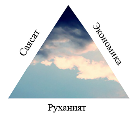 Енді Конституцияның қағидаттарын іске асыру үшін компас сияқты Қазақстанның идеологиялық доктринасы болуы керек. Ұлттық идеологиямыздың 3 тұғырлы даму идеясын ұсынбақшымын. Ол тең қабырғалы үшбұрыш секілді, оның ұстанымы – руханият, саясат және экономика. Үшеуі бірдей нығайған жағдайда ғана өрлеу қамтамасыз етіледі. (1-сурет)