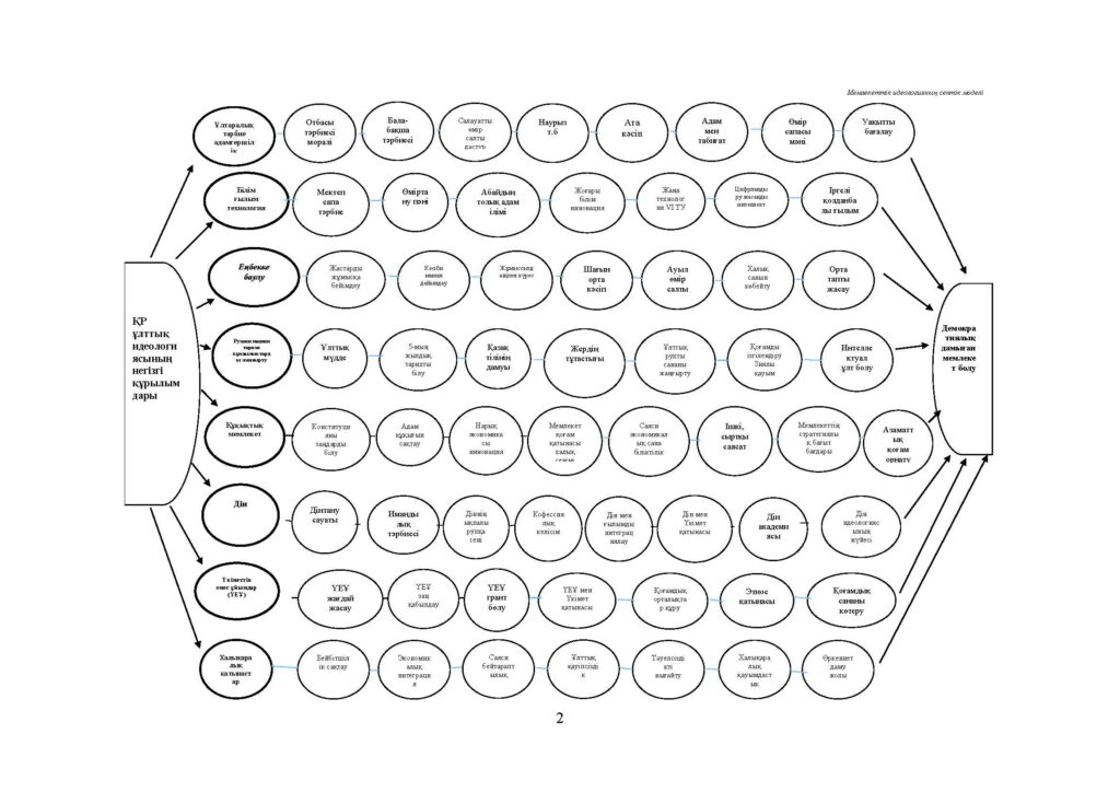 ІІ. Менің ойымша бәріміздің басымызды қосатын Қазақстанға бір ғана идеология қажет, ол – біртұтас жалпыхалықтық гуманистік идеология. Ендеше Қазақстанның ұлттық идеологиясының негізгі құрылымдарына, ұстанымдарына қысқаша тоқталайын. Жаңа ұлттық идеологияның сеттік моделі ретінде арнайы 2-суретте көрсетілгендей ұлттық идеологияның құрылымдары 8 тарамға бөлінеді. Бұлар: рухани, мәдени-тарихи құндылықтар, құқықтық мемлекет, ұлттық тәрбие, адал азамат, білім, ілім, дін, еңбек адамы, кәсіби біліктілік, заң мен тәртіп, үкіметтік емес қоғамдық ұйымдар, халықаралық қатынастар. Бұлардың әрқайсысы өз бағыттарымен қоғамдық қатынасқа, мемлекеттің дамуына қызмет етеді. Негізінде біз қазақтың ұлттық мүддесін, яғни тәуелсіздігімізді нығайту, жеріміздің тұтастығы, тіліміздің дамуы, дініміздің бір мазһабының сақталуы, мәдени, салт-дәстүріміздің өркендеуі, міне, осы құндылықтарды берік ұстап, дамытсақ, мақсатымызға жетеміз. Ол – демократиялық, дамыған мемлекет болу. Бұл мақсат үшін қазақ халқы титулды ұлт ретінде бір идеяның астына бірігіп, басқаларды да тартып, түркі тегінен келе жатқан бар ар-намысын, күш-жігерін салуы керек.