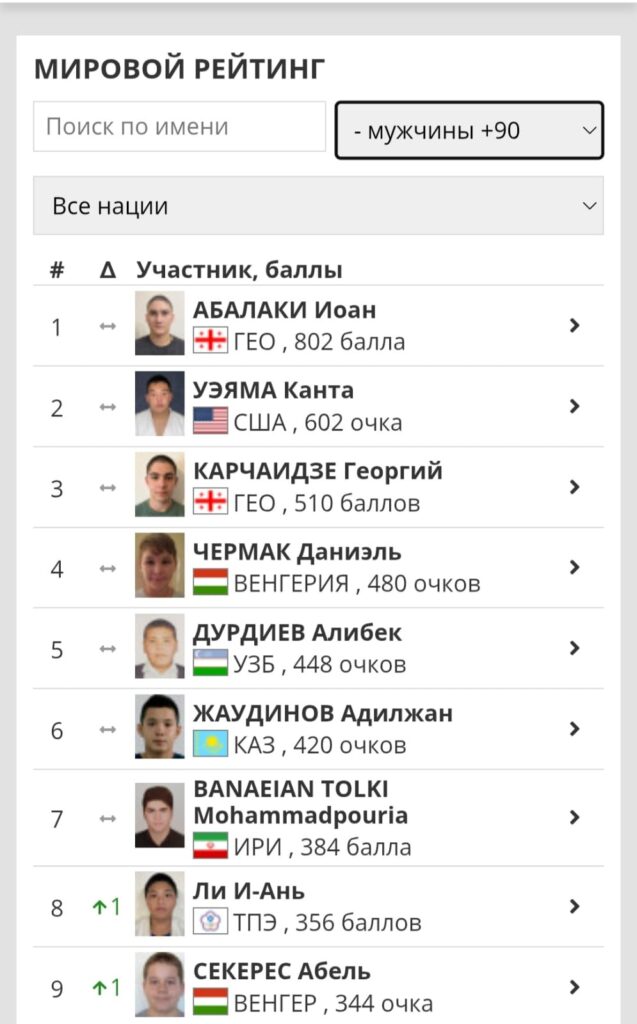Дзюдошы Әділжан Жаудинов кадеттер арасында әлемдік рейтингте 6 орында тұр. Үздік ТОП-6 елдің дзюдошылары: