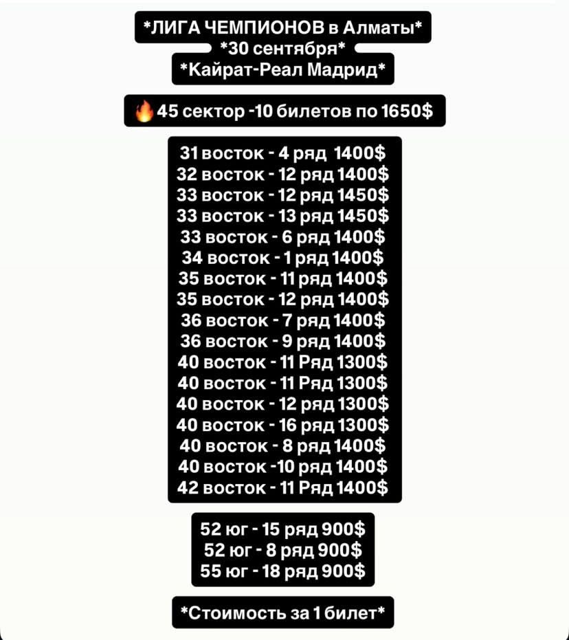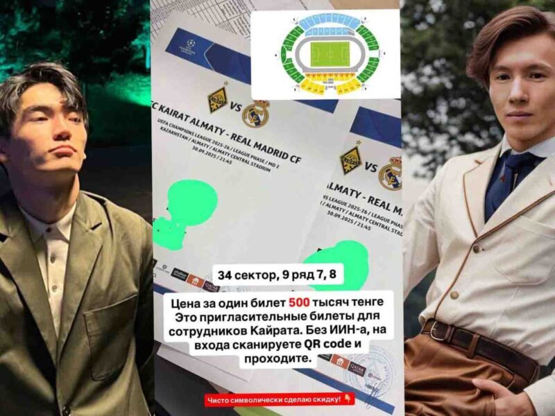 Алматыдағы тарихи «Қайрат» – «Реал Мадрид» матчы алдындағы басты тақырыптардың бірі – билет бағасының аспандап кетуі. Белгілі әнші Нұрлан Еспановтың ұлы Олжас Еспанов Instagram желісінде кемінде 20 билет саудаға шығарған. Бір билеттің бағасы 494 мың теңгеден басталып, 768 мың теңгеге дейін жеткен. Бұл туралы penalty.kz. жазды.