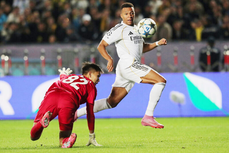 Матчтың бастапқы минуты сенсациялы басталды. Нақтырақ айтсақ, «Қайрат» кенеттен шабуыл ұйымдастырып, Дастан Сәтпаевтың баспен ұрған соққысы баяу болып, Куртуа бір голдан аман қалды. Ойын одан соң түбегейлі «Реалдың» тарапына өтті. Бірақ, өзінің деңгейіне сәйкес доминация көрсете алмай, әбден қиналды. «Қайрат» қинады да. Біздің ойыншылар мадридтік қонақтарды қыспақтап, прессингке салды. Сол себепті «Реалдың» қай шабуылы да мардымды болған жоқ. Тек ойынның 20-минутына тақаған тұста Винисиуста бірге бір, Шерхан Қалмұрзаға қарсы мүмкіндік болғанымен, оңды пайдала алмады, қиыс кетті. Арада сәл уақыт өткен соң, яғни 25-минутта қорғаушылар қателігінен кейін абдырап қалған Шерхан абайсызда Франко Мастантуоға қарсы тәртіп бұзып, 11-метрлік айып добы белгіленді. Әдетте пенальтиден мүлт кетпейтін Килиан Мбаппе бұл жолы да мүмкіндігін оң пайдаланды. Одан кейін де «Реал» үстемдік еткендей көрінгенімен, жөнді шабуыл болған жоқ. Тиісінше, бірінші тайм тең тамамдалды.