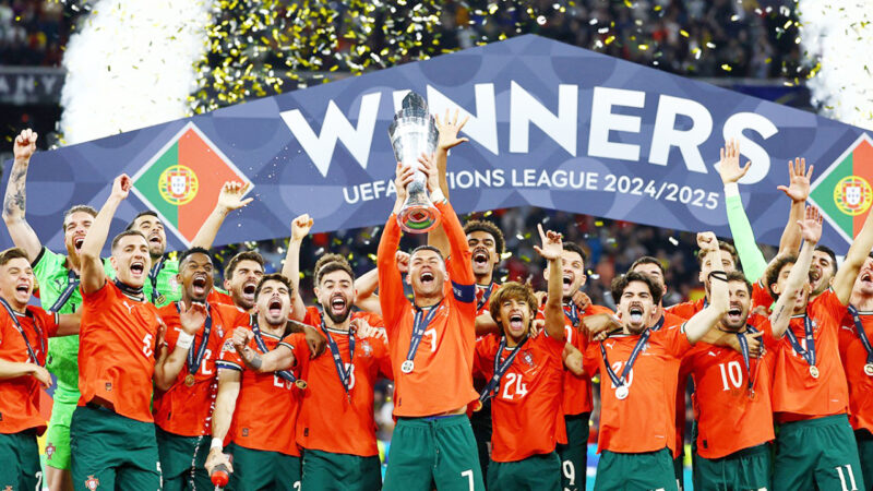 Португалия Испанияға қарсы. Жалпы қос команда географиялық тұрғыда бір-біріне жақын орналасқан. Сәйкесінше, өзара көп матч өткізіп тұрады. Бас-аяғы қырыққа жуық кездесудің басым бөлігінде испандықтар жеңіске жеткенмен, соңғы жиырма жылдықта екі құрама тең тарқасып келеді. 2010 жылы Испания Әлем чемпионатын жеңген тұста 1/8 финалда дәл сол португалдықтарды қапы қалдырған. Ал 2012 жылы жартылай финалда пенальти сериясы бойынша тағы да «Қызыл фурия» жеңіске жеткен. Бірақ, 2018 жылы Ресейде өткен мундиалда көршілес мемлекеттер арасындағы ойын нәтижесі тең аяқталды. Сол кездегі Криштиану Роналдудың хет-тригі футболсүйер қауымның есінде. Ендігі кезек – Ұлттар лигасының финалында. Қос құрама да сақадай сай. Мен-мен деген ойыншылар шақыртылып, негізгі құрамға шыққан. Испания сапында  Нико  Уильямс,  Ямаль сынды  жүйріктер, Педри сияқты маэстро, қорғаныс  шебінде болашақ  «Реалдың»  аңызы  Дин Хейсен. Португалия құрамасы да осал емес. Криштиану бастаған командада да Бруну Фернандеш, Витинья, Нуну Мендеш сынды ойқастап тұрған ойыншылар бар. Әсіресе, соңғысы финалда жанын салып ойнады. Ойынның 21-минутында Ямальдың асырған добын қабылдауда Жоау Невештің жасаған қателігін оңды пайдаланған Мартин Субименди есеп ашты. «Арсеналдың» болашақ ойыншысы «Алтын доп» иесі Родриді жоқтатпады. Бірақ испандықтардың қуанышы көпке созылған жоқ. Небәрі бес минут өткен соң Нуну Мендеш «Қызыл фурияның» оң жақ қорғаушысы Мингесаны балаша алдап өтіп, күтпеген жерден қақпаға дәл соққы бағыттады. Есеп – 1:1. Ойын тартысты өтуде. Испания допты ырығына көндіріп, Нико жақтан қайта-қайта шабуылдай берді. Тек таймның аяқталуына санаулы уақыт қалғанда Оярсабаль өзіне берілген мүмкіндікті мүлт жібермей, испандықтарды лайықты түрде алға шығарды. Дегенмен, екінші таймның орта тұсында, яғни 61-минутында Криштиану Роналду маңызды гол соғып, негізгі матч қорытындысын теңестірді. Артынша ойын экстра-таймға созылып, онда да ештеңе шешілмей, пенальти сериясына жалғасты. Пенальти тебуде Португалия құрамасының тәжірибесі молырақ екені белгілі. Атап өткендей, португалдықтар әр мүмкіндіктен жаңылыспай, испандықтардан Альваро Мората қателесіп, 5:3 есебімен Поругалия жеңіске жетті. Жеңе отырып, Ұлттар лигасының екінші мәрте чемпионы атанды. 2019 жылы да Роналду бастаған команда Нидерландыны  қапы  қалдырып, чемпион  атанған-тұғын.